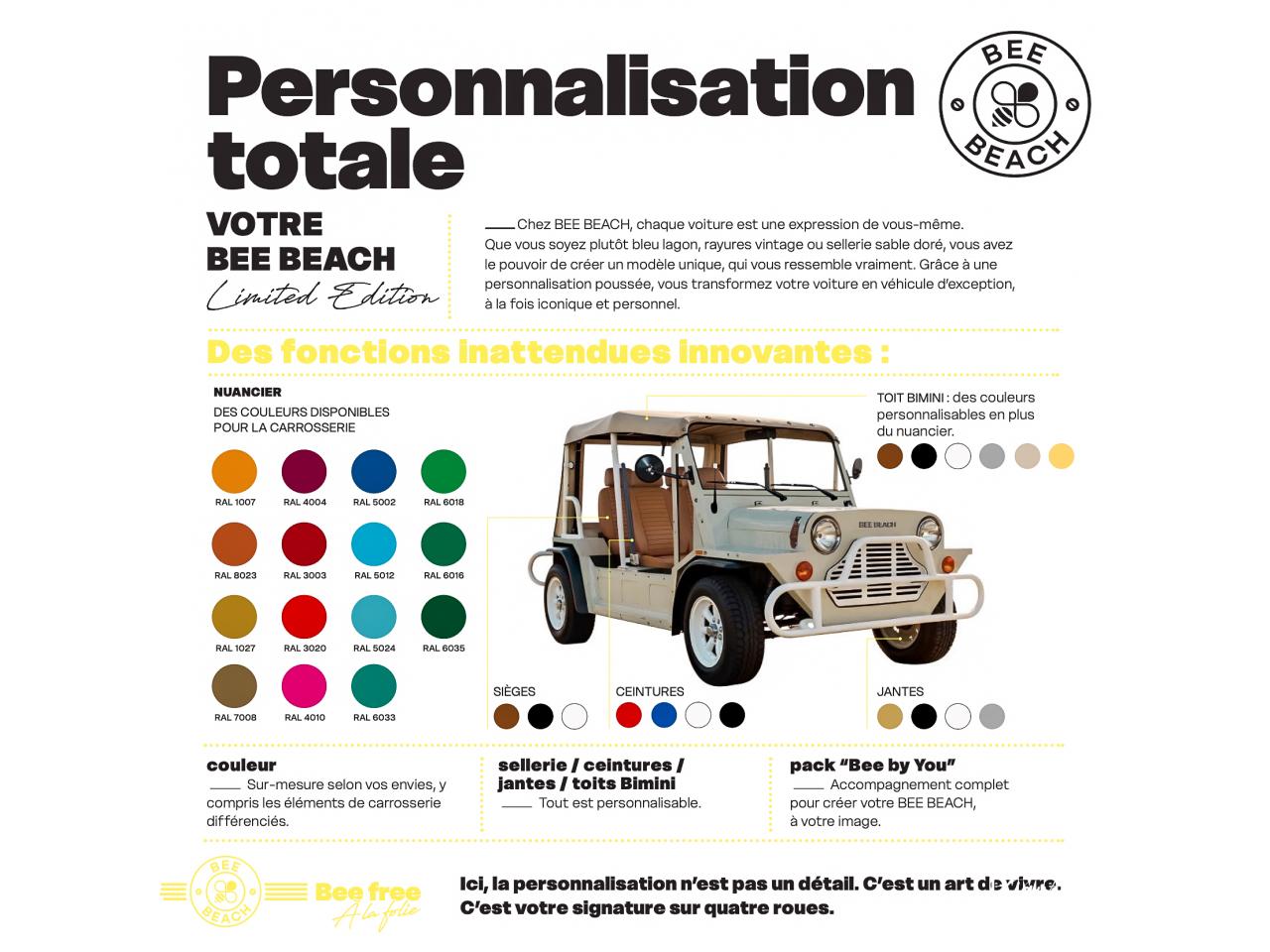 La Bee Beach est une voiture électrique de style plage, conçue pour la mobilité douce, les balades à la mer et les trajets loisirs ou autour de votre résidence secondaire. Elle est souvent décrite comme une réinterprétation moderne et électrique des Mini Moke / beach car rétro / 2 cv / Méhari / Jeep Willys / Defender , alliant design joyeux, simplicité et zéro émission.